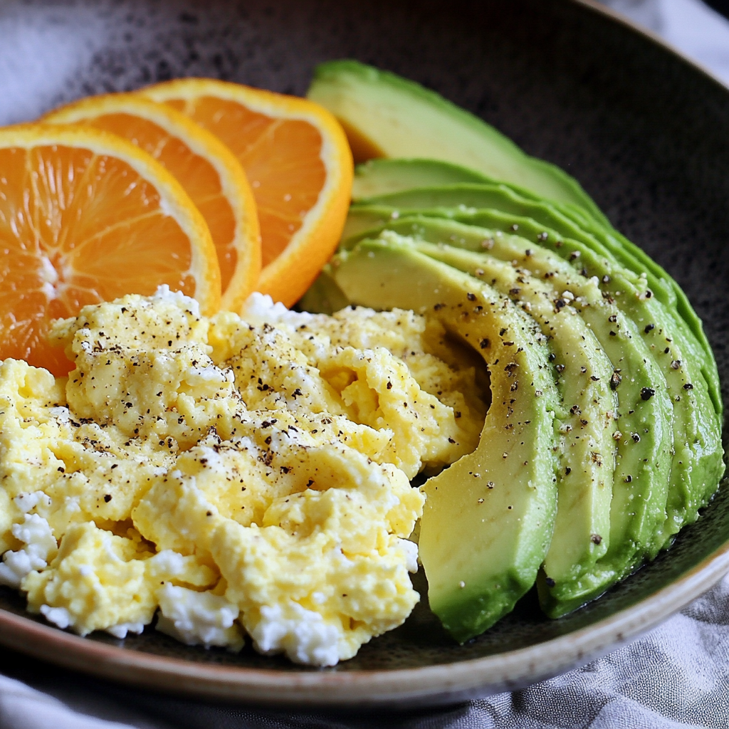 - On a serving plate, arrange sliced avocado next to the scrambled eggs, add a generous scoop of cottage cheese, and finish with fresh orange slices.