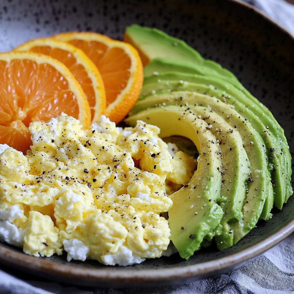 - On a serving plate, arrange sliced avocado next to the scrambled eggs, add a generous scoop of cottage cheese, and finish with fresh orange slices.
