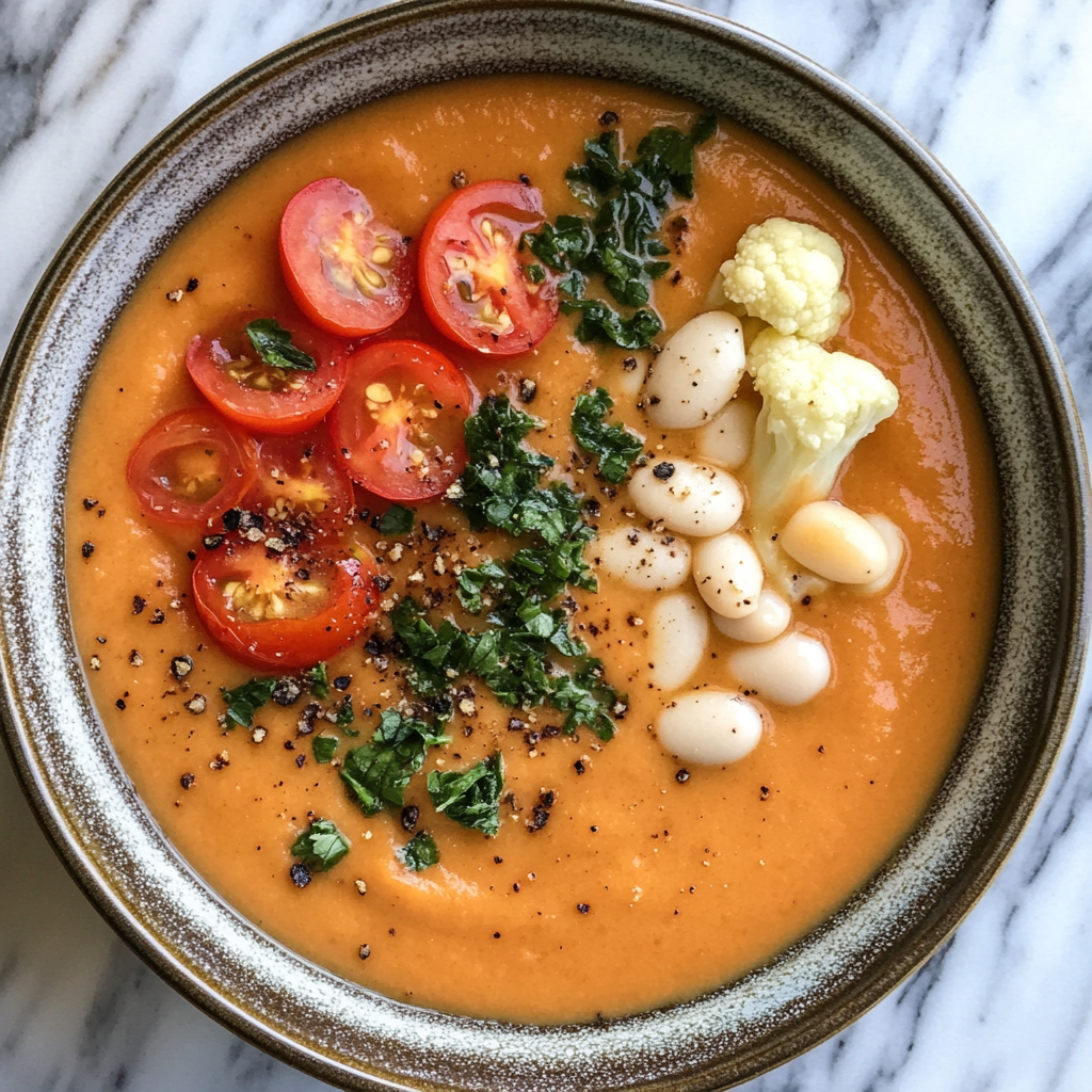 Creamy Vegan Tomato and Cauliflower Bisque is a heartwarming, nutrient-rich soup that makes for an ideal meal any time of the year. This delightful bisque blends roasted cauliflower and fresh tomatoes into a velvety texture, creating a dish that is both comforting and nutritious. Packed with hidden veggies and wholesome ingredients like white beans, it serves as a perfect light lunch or satisfying dinner option. Pair it with crusty bread or a fresh salad to elevate your dining experience. Quick to prepare and easy to customize, this bisque is sure to become a family favorite.