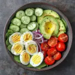 - Add cucumber slices, halved cherry tomatoes, diced avocado, diced red onion, and sliced eggs on top.