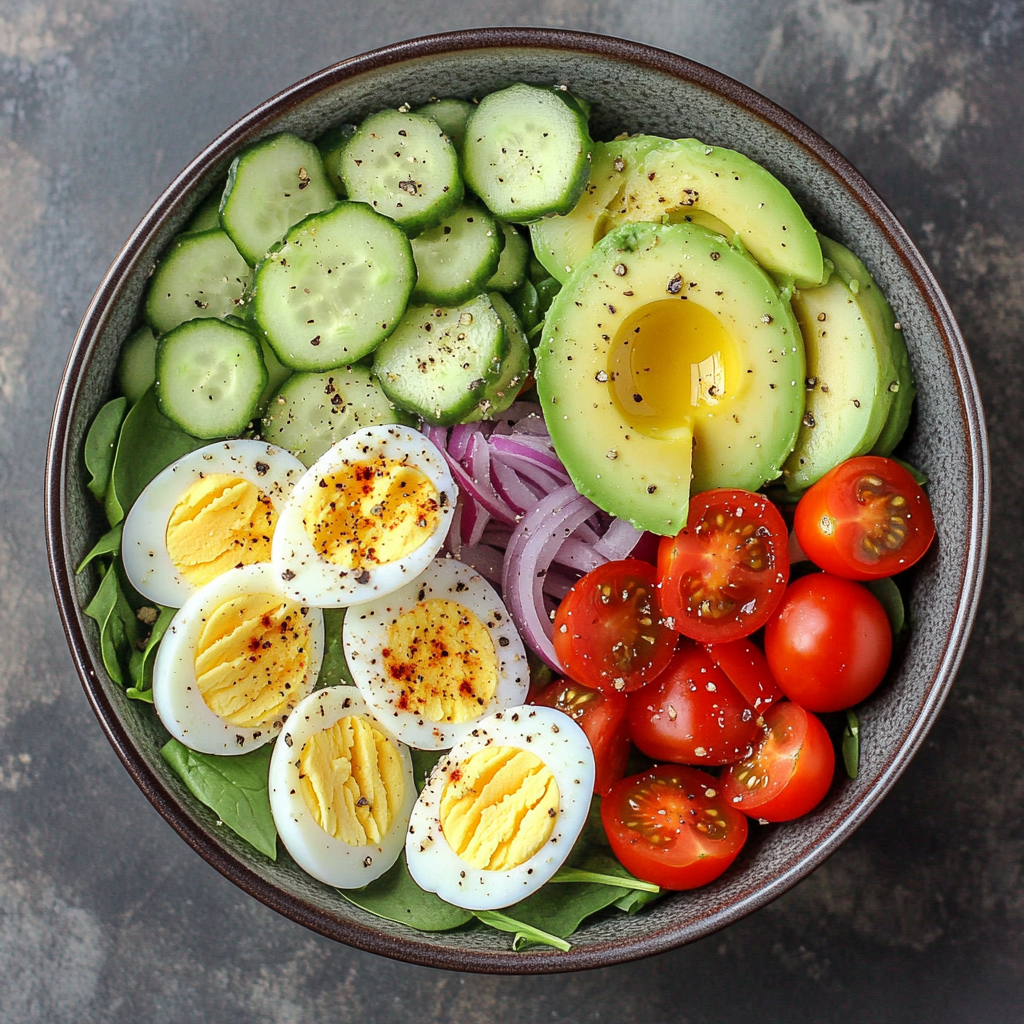 - In a serving bowl, layer fresh spinach as the base. Top with cucumber slices, halved cherry tomatoes, diced avocado, diced red onion, and sliced eggs.