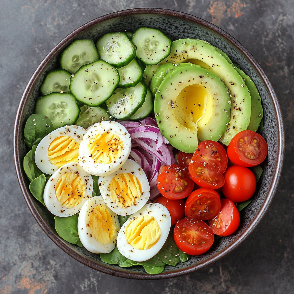 - In a serving bowl, layer fresh spinach as the base. Top with cucumber slices, halved cherry tomatoes, diced avocado, diced red onion, and sliced eggs.