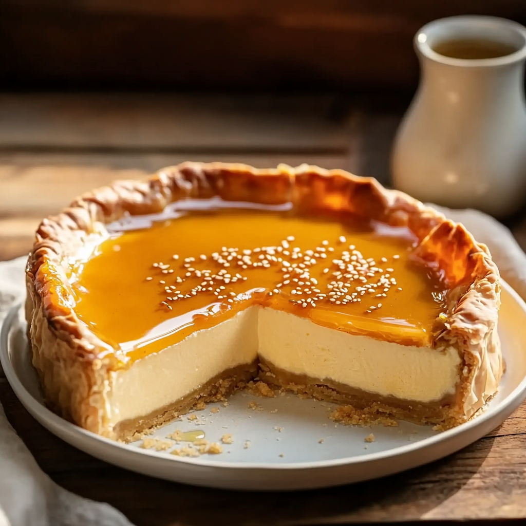- Drizzle warmed honey over the pie and sprinkle with toasted sesame seeds.