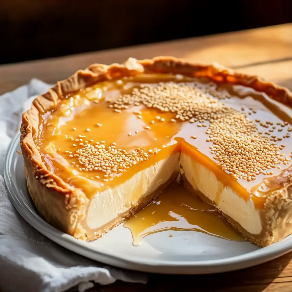 - Drizzle warmed honey over the pie and sprinkle with toasted sesame seeds.