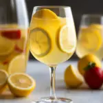 A bright and citrusy Limoncello Sangria made with white apple vinegar, fresh strawberries, lemon slices, and club soda.