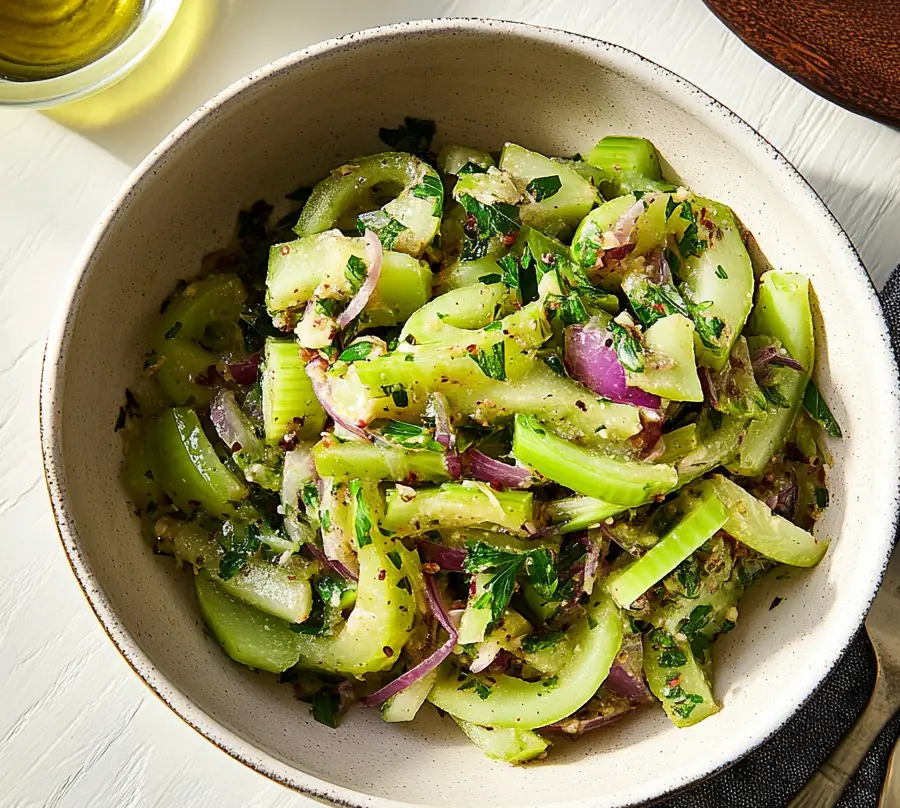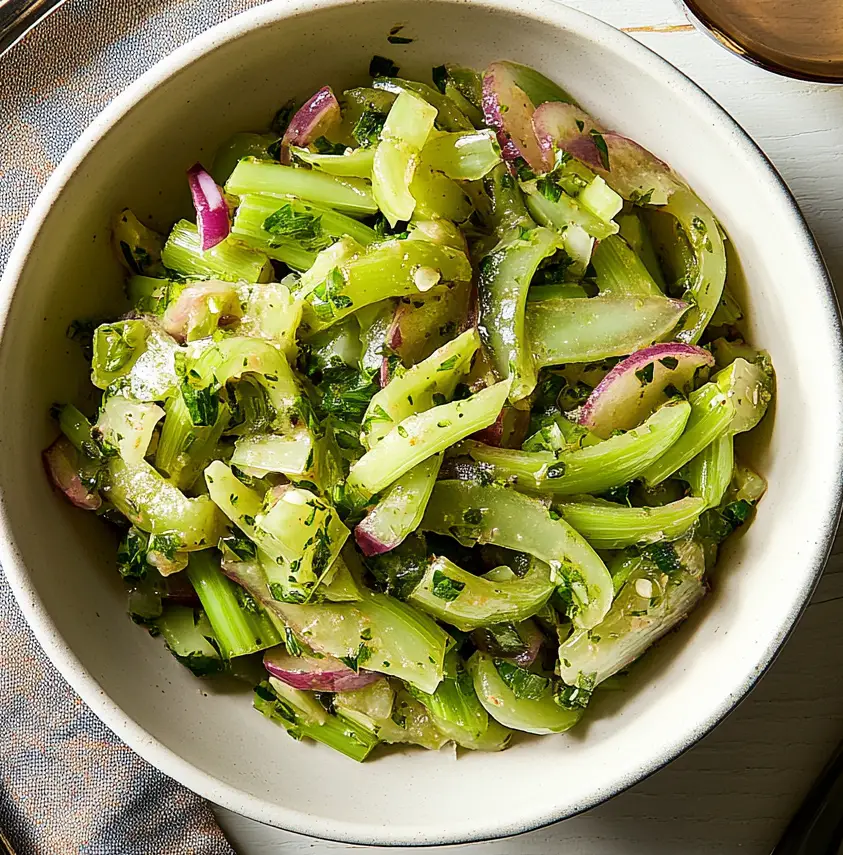 Marinated Celery Salad is a refreshing dish made with crisp celery, onions, herbs, and a tangy dressing that enhances its natural flavors.