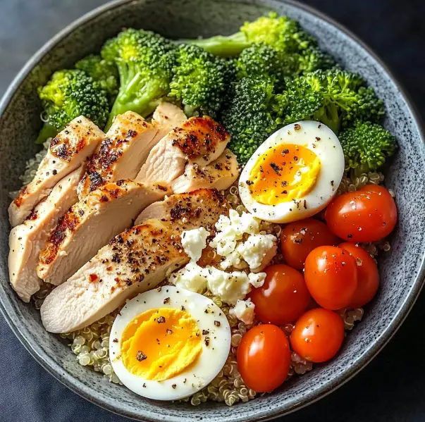 A Protein-Packed Quinoa Bowl with Chicken, Eggs & Feta is a nutritious meal featuring quinoa, chicken breast, soft-boiled eggs, broccoli, cherry tomatoes, and feta cheese. Itβs perfect for those seeking a balanced diet rich in protein.