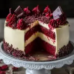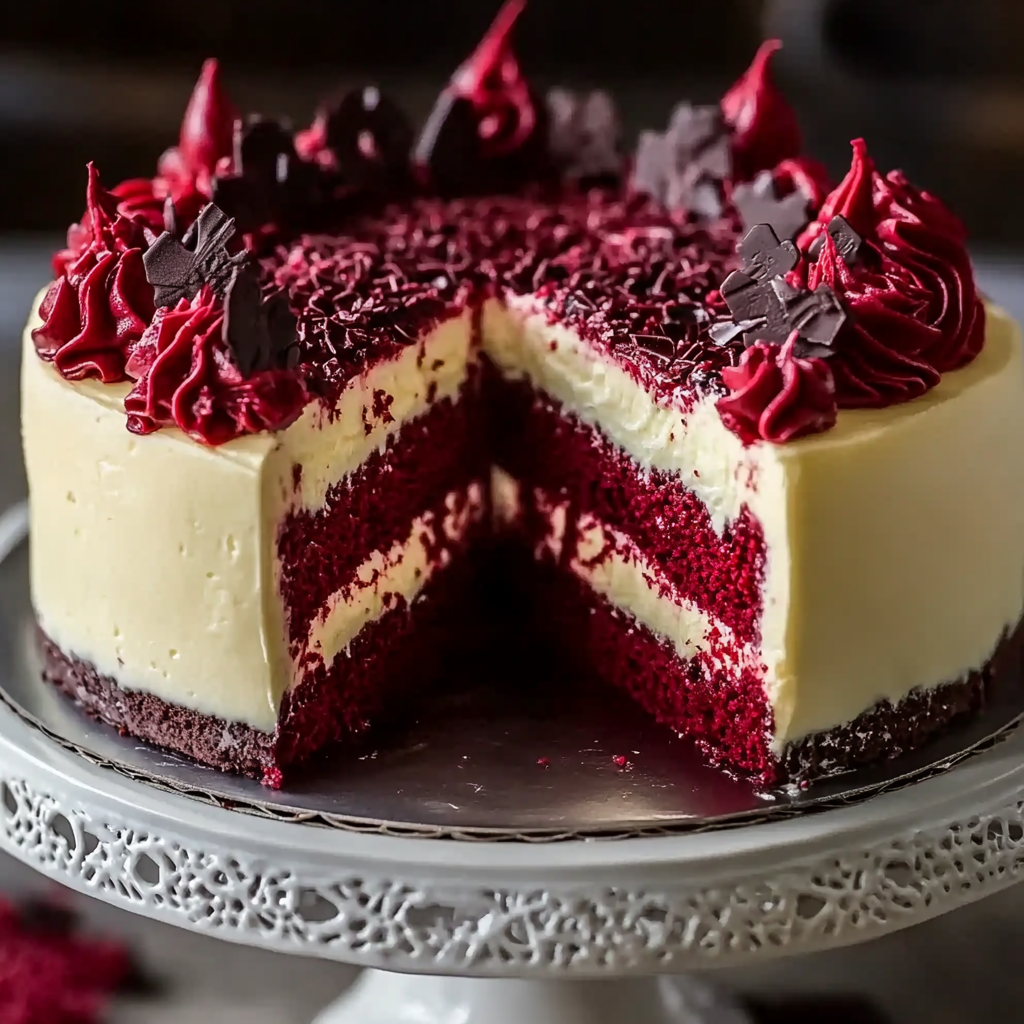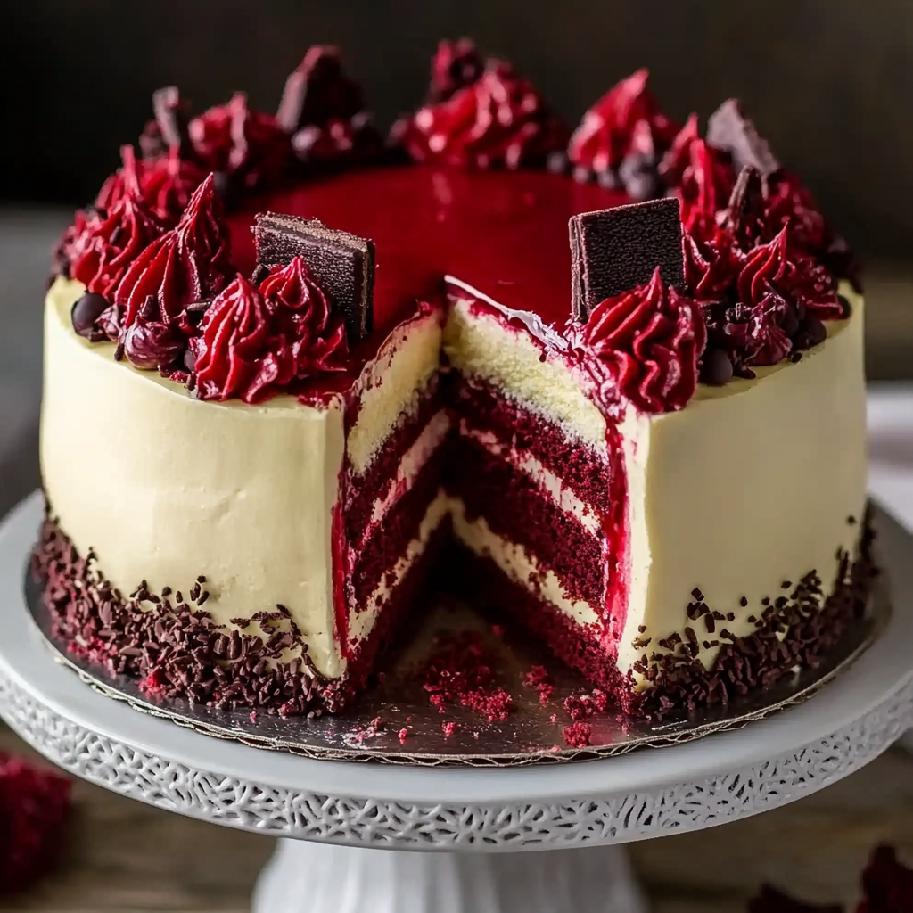 This decadent Red Velvet Cheesecake Layer Cake combines the rich, creamy texture of cheesecake with the vibrant flavor and classic color of red velvet cake. Featuring a chocolate cookie crust, moist red velvet layers, a luscious cheesecake center, and a smooth cream cheese frosting topped with a glossy red berry glaze and decorative crumbs and chocolate chips, this cake is perfect for celebrations or indulging your sweet tooth with a show-stopping dessert.