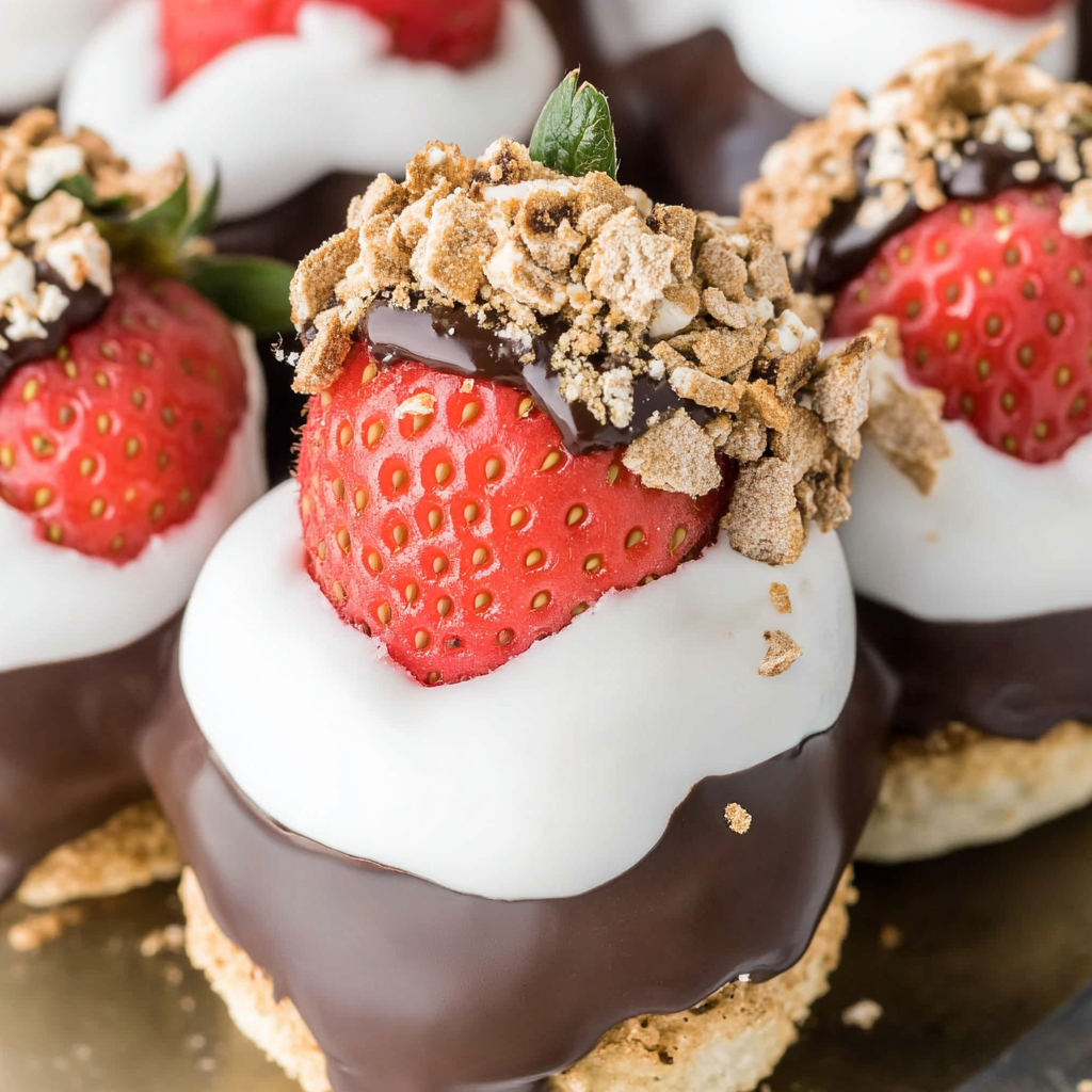 Indulge in the delightful twist of Sโmores Strawberries, where the classic sโmores flavor meets juicy strawberries. This dessert features fresh strawberries dipped in gooey melted vegan marshmallows and rich milk chocolate, then finished with a crunchy graham cracker crumble. Perfect for parties, cozy nights, or special celebrations, these treats are quick to make and customizable to suit any palate. With their eye-catching presentation and irresistible taste, Sโmores Strawberries will impress your guests and satisfy your sweet cravings.
