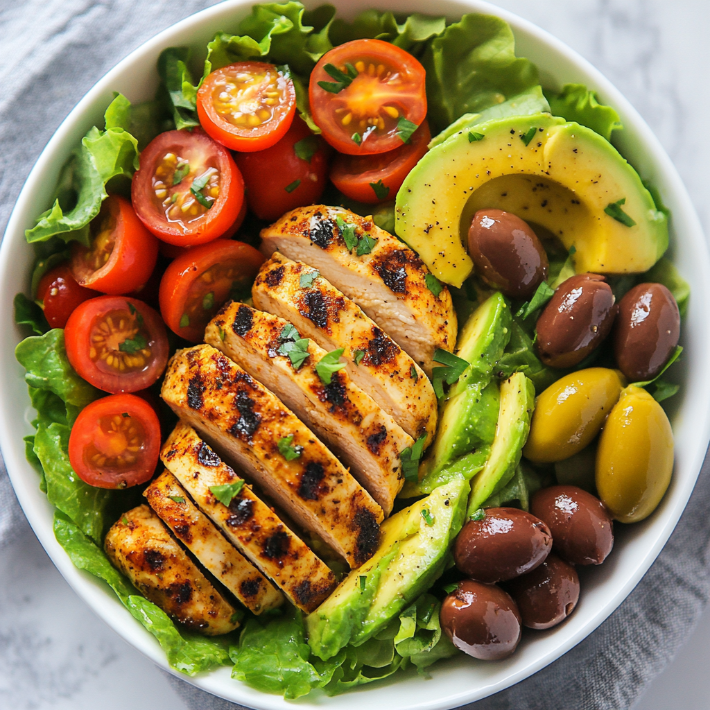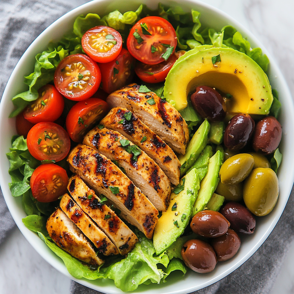 The salad includes grilled chicken breast, romaine lettuce or mixed greens, cherry tomatoes, avocado, green olives, and optional olive oil or lemon juice.