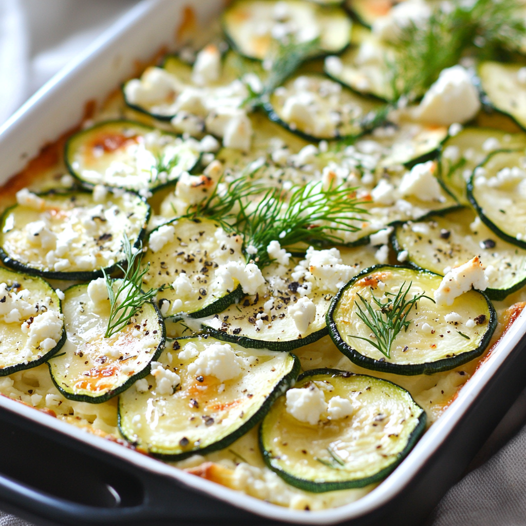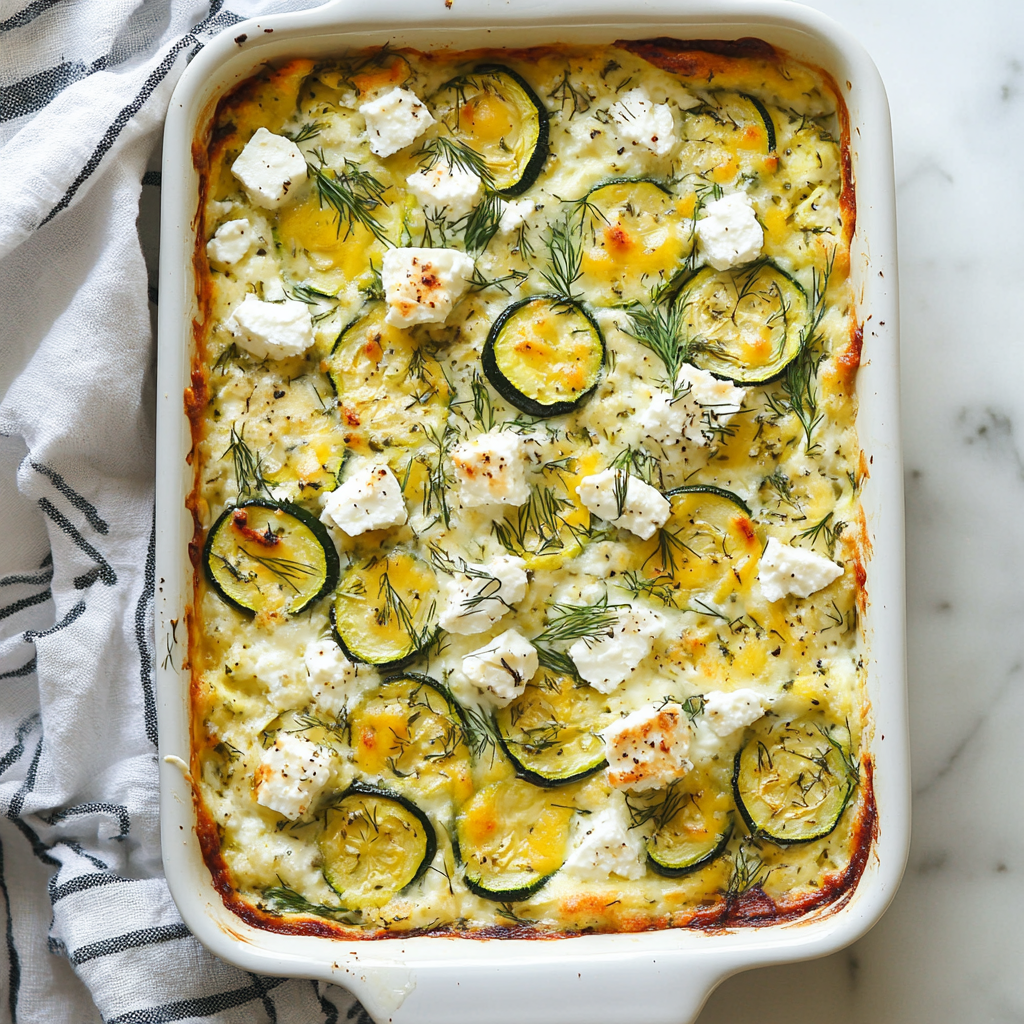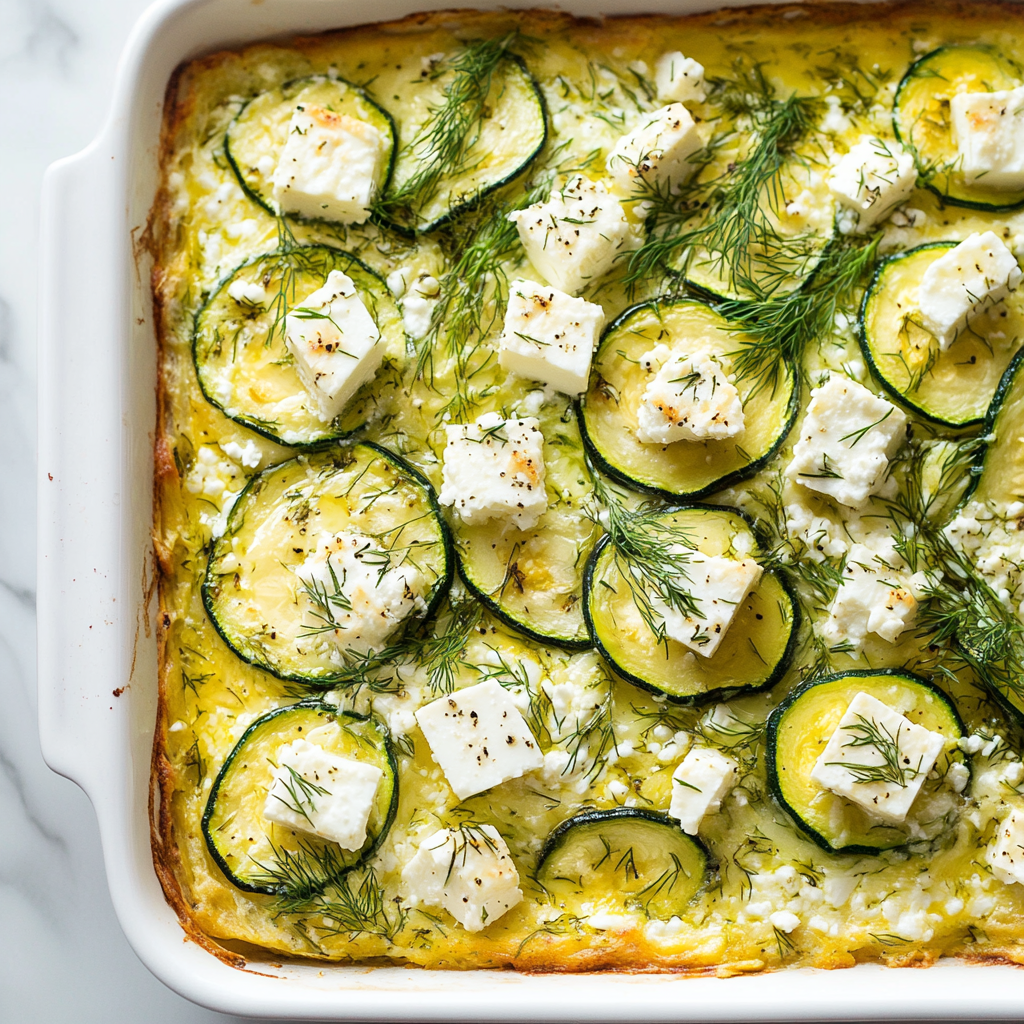 Zucchini Feta Cottage Cheese Bake is a savory dish made with layers of zucchini, feta cheese, and cottage cheese, baked to perfection.